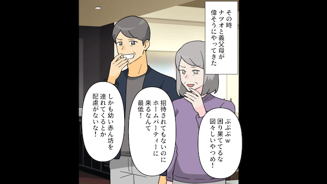 今回は『離婚後…義両親「孫の養育費振り込め!」嫁「私が育ててるけど?」⇒真実を伝えた結果』を紹介します。 主人公への嫌がらせがうまくいき、大喜びする夫と義両親。 さらに義父が「俺の職場の上司が今度大きなホームパーティーをやるらしい」と話し始めて…。