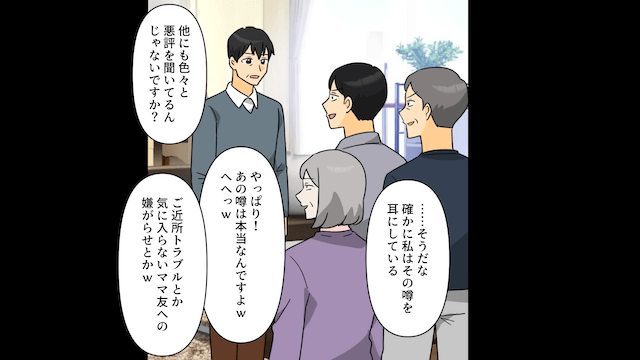 ホームパーティーの日、主催者である義父の上司が「あなたは招待していませんが」と主人公に告げると、夫と義両親は嬉しそうに主人公の断罪を始めました。 3人は主人公の悪評は真実だと主張し、娘の親権は夫にあると言い放ちます。