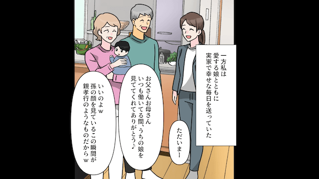 そして夫は義両親の無茶苦茶な要求に疲弊しながら暮らし、主人公は実家で娘と両親と幸せに暮らしたのでした。