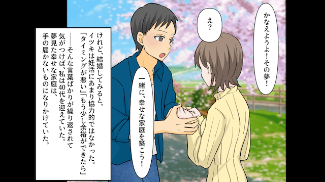 主人公が「妊活に協力できないなら離婚しましょう」と告げると、夫は焦って謝罪してきました。 結婚前、子どもを育てるのが夢だと話す主人公に、夫は「叶えようよ!その夢!」と言ってくれていましたが、結局妊活には協力的ではなく…。