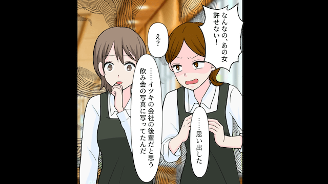 夫と女性のマタニティフォトを見た主人公が驚愕すると、女性は「やっぱりあなたが奥さんなんだ」と言い、浮気を自白して挑発してきました。 そして女性の退店後、主人公は女性が夫の会社の後輩だと気づいたのです。
