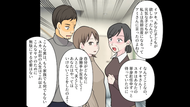 主人公が慰謝料を請求すると、夫は必死に謝罪し「俺はだまされてただけなんだって!」と被害者面を始めました。 しかし主人公が許すはずもなく、夫は泣きながらすがって…。