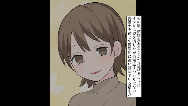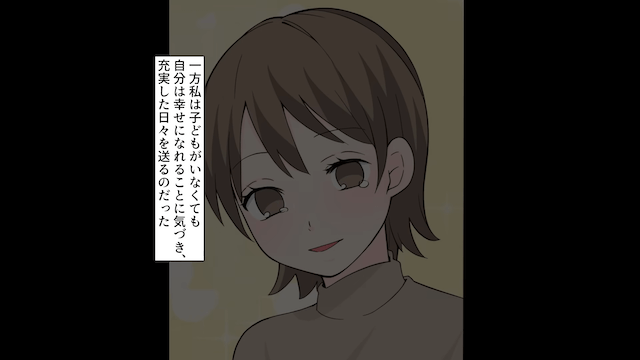 必死にすがってくる夫に向かって「許してほしいならひとつ条件がある。私に償い続けて」「一生、あなたを許さないけどね」と告げた主人公。 その後、主人公は子どもがいなくても幸せになれることに気づき、充実した毎日を送ったのでした。