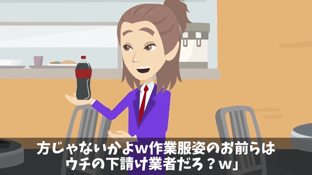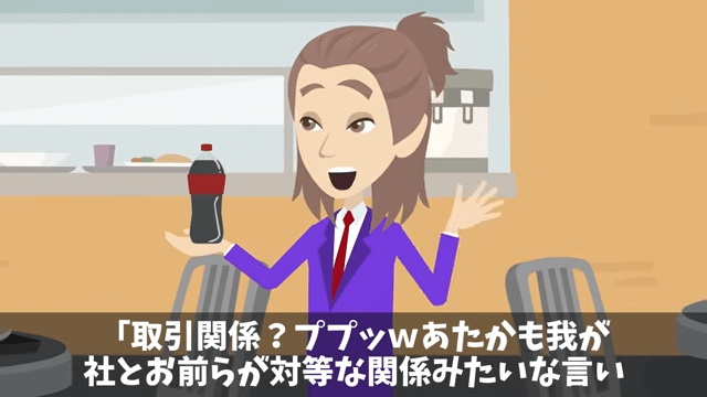 女性社員はまさかの事態に驚き、主人公にジュースをかけた取引先の部長を責めました。 すると取引先の部長は「ププッ。あたかも我が社とお前らが対等な関係みたいな言い方じゃないかよ」と笑ったのです。