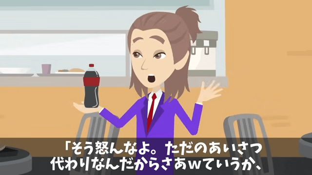 今回は『俺に“ジュースをかけた”社員「下請けは食堂使うな」直後⇒俺「取引先ですが?」社員「え?」』を紹介します。 女性社員は、主人公にジュースをかけた取引先の部長に「ひ、ひどい!ウチと御社は取引関係にあるというのに!」と言いました。 すると取引先の部長は「作業服姿のお前らはウチの下請け業者だろ?」と言って笑い…。