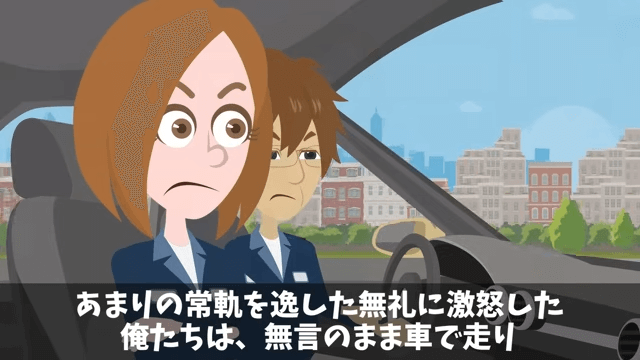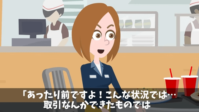 取引先の部長の行動に腹を立てた主人公は「頭にきた!商談は…中止だ!」と言いました。 すると女性社員も「あったり前ですよ!こんな状況では…取引なんかできたものではありませんからね!」と同意し、2人で自社に戻ったのです。