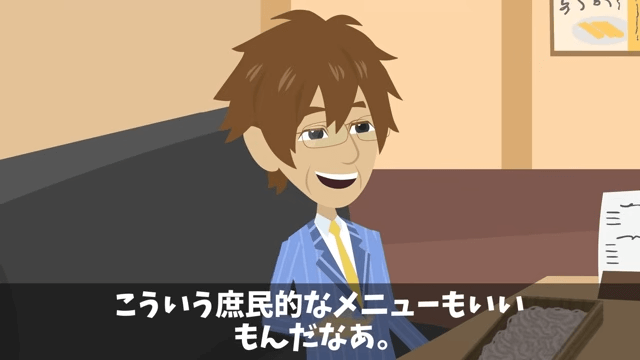 社長と秘書が料理に満足している姿を見て、うれしい気持ちになった主人公。 そして主人公は、いつも食べている高級料理も悪くないものの、たまには庶民的なメニューもいいものだと思ったのでした。