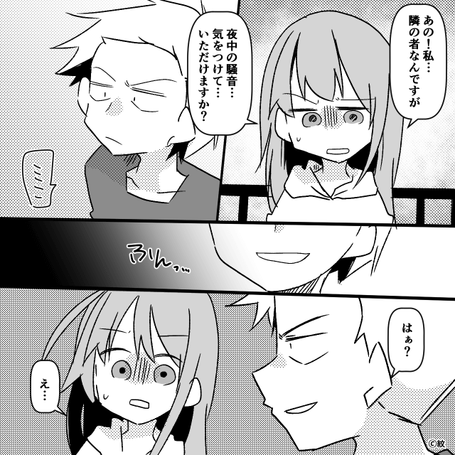 大家が適当な対応をする人物だと知り、主人公は不安を感じます。 それから1ヶ月後、主人公は深夜の隣人の騒音に悩み、直接注意をしました。