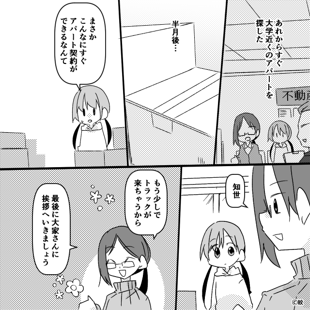 今回は『初めての一人暮らし、隣人はヤバい男でした。』を紹介します。 母は大家があてにならないと察し、主人公に引越しを勧めてくれます。 結局、主人公は初めて自分のお金で借りたアパートを、泣く泣く解約することになったのでした。