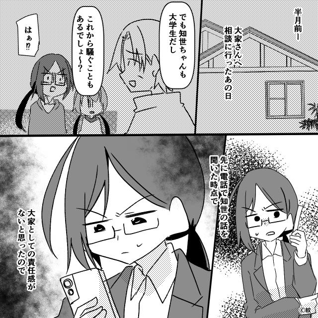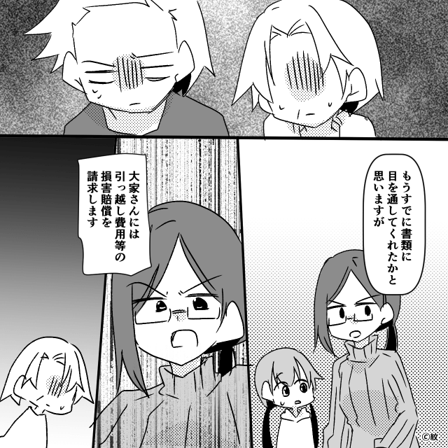 今回は『初めての一人暮らし、隣人はヤバい男でした。』を紹介します。 主人公と母が大家に最後の挨拶に行くと、そこには顔面蒼白の大家と隣人がいました。 大家は突然頭を下げてきて、主人公は唖然とし…。
