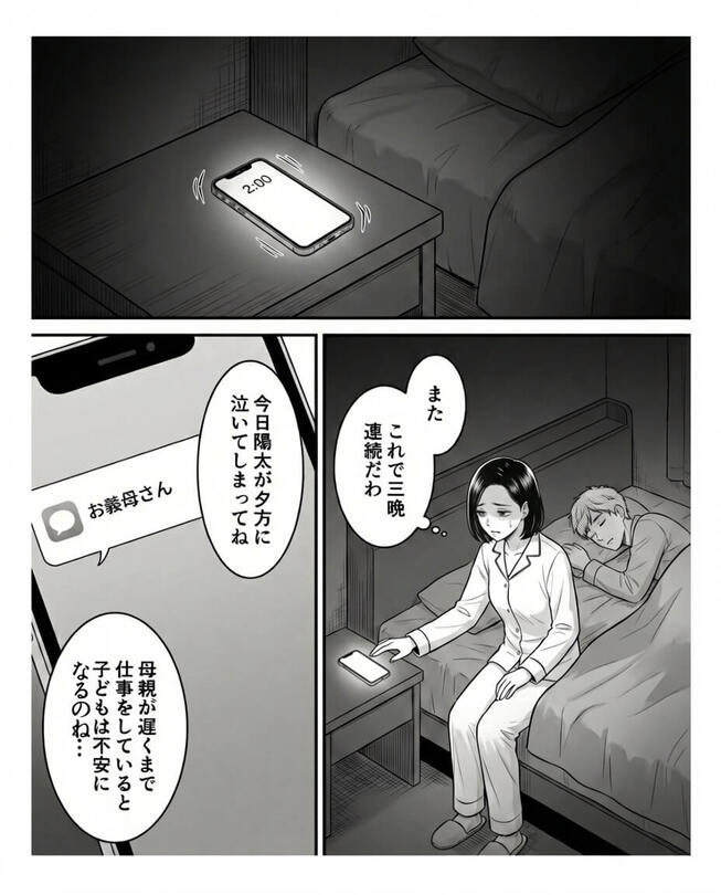 昇進という光を掴みかけた矢先、影のように忍び寄る不穏な気配。 信頼していた義母の冷徹な眼差しと、自分を責めるような子どもの絵に、妻の心は激しく揺れ動きます。 誰にも言えない孤独を抱え、暗闇の中で光ったスマホの通知。 そこに並んだ「しあわせな家庭」という言葉は、救いへの扉だったのでしょうか。 それとも、すべてを壊し尽くす悪夢への招待状だったのでしょうか。 家族という密室の中で、静かに、けれど確実に何かが狂い始めていく…。 日常の裏側に潜む歪みが、今、ゆっくりとその正体を現そうとしています。 見えない敵に追い詰められていく、1人の女性の葛藤を見守ってください。
