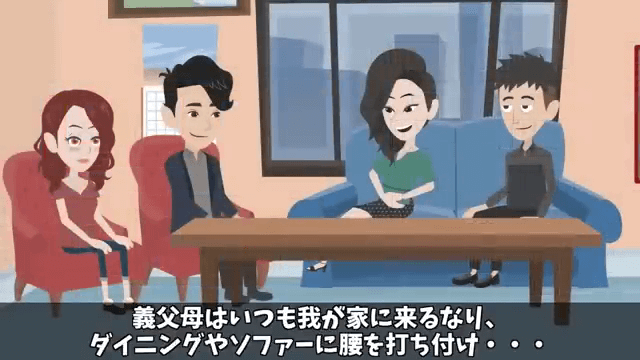 義両親は平日の夜や祝日などに、よく主人公の家に遊びにくるようになりました。 そして家にやってきた義両親はソファーに座り込み…。