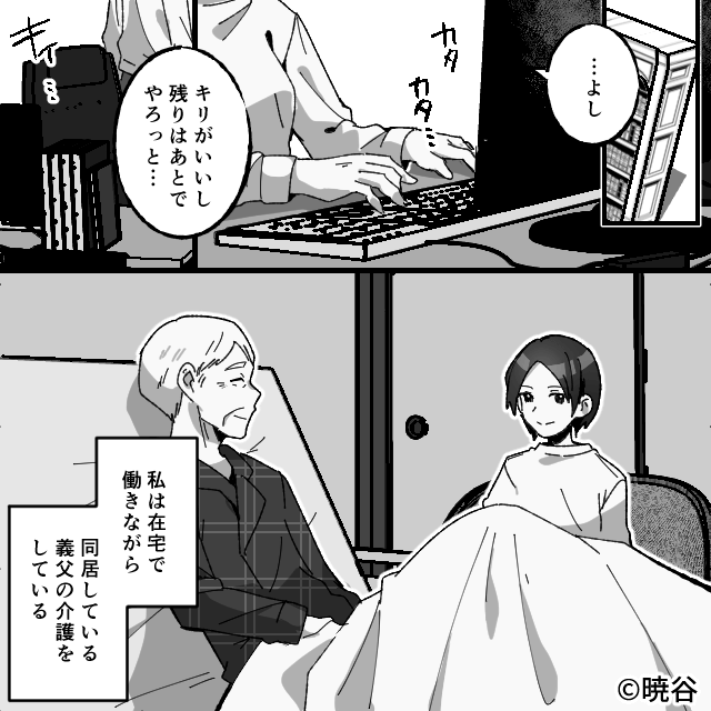 今回は『「もう父さんも長くない(笑)」父の入院を“遺産チャンス”と喜んだ結果』を紹介します。 在宅で働きながら、同居中の義父の介護をしている主人公。 夫は自分が休みでも、まったく協力してくれず…。