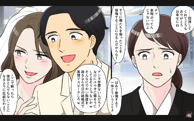 今回は『お嬢様育ちの義妹の結婚式で私を見下した新郎の話』を紹介します。 夫のお金をあてにして生活していた義妹とその婚約者は、自分たちの結婚式で主人公の悪行を暴露し、主人公と離婚した夫を実家に呼び戻そうと考えました。 一方そのころ、主人公は新居で夫に「義実家を捨てる形になって本当によかったの?」と聞いていて…。 すると夫は「いいんだよ」「元々、そろそろ妹にも独り立ちしてほしかったしな」と言って…。