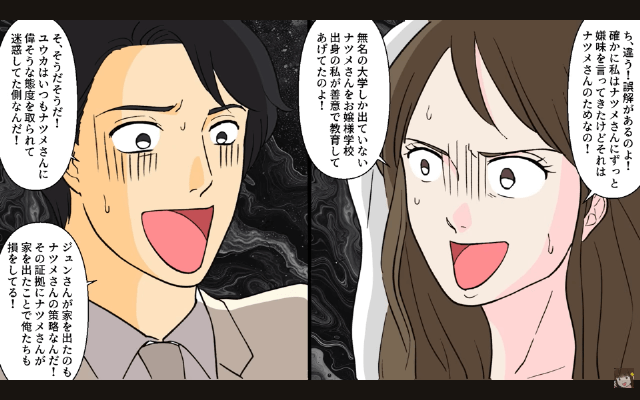 主人公が英語でのスピーチを終えると、ゲストたちは義妹と婚約者に冷たい視線を向け、英語がわからない義妹と婚約者は焦り出しました。 そして義妹はこれまでイヤミばかり言っていたのは学歴が低い主人公を教育するためだったのだと言い訳をし、婚約者も主人公のせいで夫のお金を受け取れなくなったのだと話したのですが…。