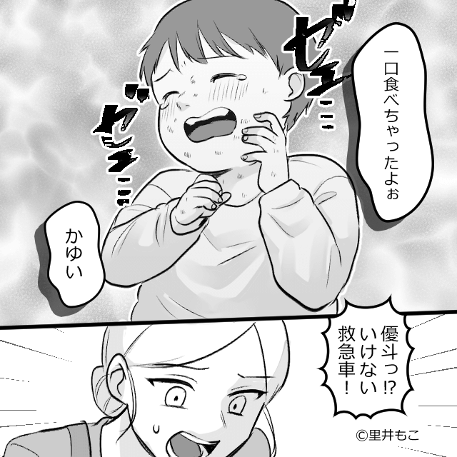 主人公が慌てて息子に駆け寄ると、息子は「一口食べちゃったよ」と言いながら苦しそうにしていて…。