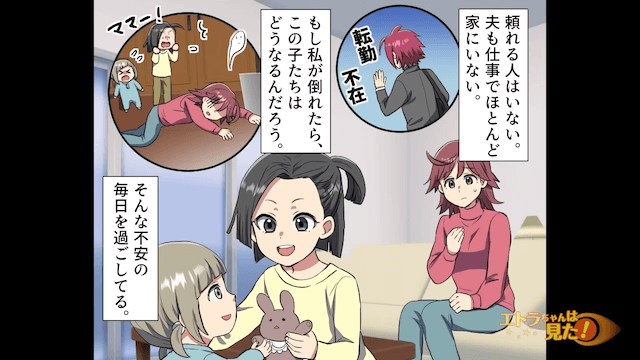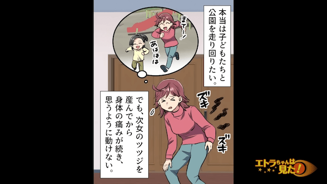 今回は『ママ友「産後に動けないとかサボり?(笑)」とバカにしてきた女の末路』を紹介します。 主人公は転勤族の夫を持つ二児の母です。 しかし次女を産んでから体の痛みが続き、思うように動けない日々を過ごしていて…。