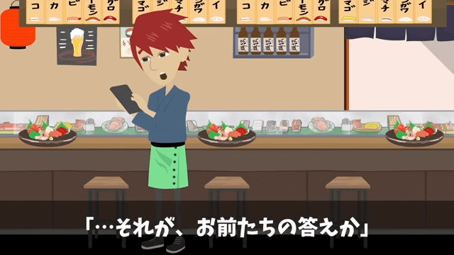 同級生は主人公に「悪い悪い!お前の店、キャンセルしといたから!」と言いました。 それを聞いた主人公は「…それが、お前たちの答えか」とつぶやいて…。