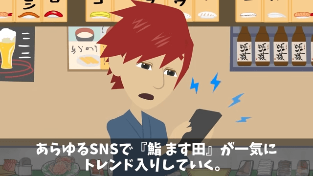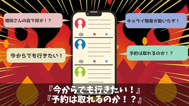 本部長の指示から数分も経たずに主人公のスマホの通知が鳴りっぱなしになりました。 そして、あらゆるSNSで主人公の店がトレンド入りしていき…。