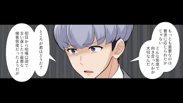 主人公は自分が覆面調査員だということを同級生に明かし、無茶な要求がすべて調査項目にあるものだったと説明しました。 さらに主人公は同級生が安物のケーキを提供したことにも気づいていて…。