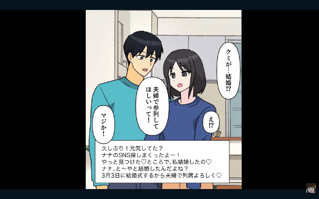 親友は主人公の話を聞かずに学校まで辞めてしまい、主人公はそのときに支えてくれたバンドマンである夫と交際して、結婚したのでした。 そしてそんな親友が送ってきたDMの内容は、主人公と夫を親友の結婚式に招待するというもので…。