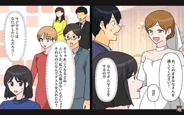 今回は『新郎新婦「あんたたちの席ないから(笑)」私たち「はぁ…」→そのまま全員で立って参加してやった結果』を紹介します。 主人公と夫は親友の結婚式に出席することに決めましたが、いざ結婚式場へ向かうと、そこには主人公と夫の席がありませんでした。 そして主人公が親友に事情を聞くと、親友は新郎に高校3年間ずっと主人公から嫌がらせを受け、主人公のせいで学校を辞めることになったのだと嘘をつき始めて…。
