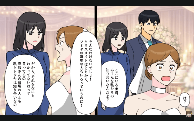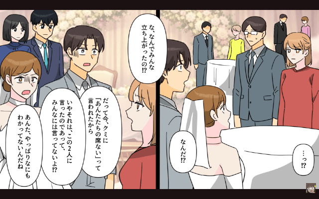 今回は『新郎新婦「あんたたちの席ないから(笑)」私たち「はぁ…」→そのまま全員で立って参加してやった結果』を紹介します。 親友と新郎は主人公と夫と揉めている最中にゲストを会場に通し、ゲストに「呼んでもないのに来ちゃった非常識な人たちがいるんです~」と言いました。 さらに新郎が「立って参加するか帰ってくれ」と言ってきたのですが、主人公は何も知らない親友と新郎にただただ呆れてしまって…。