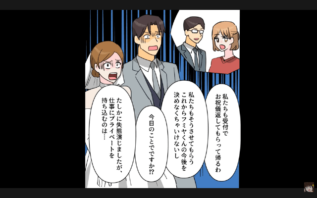 今回は『新郎新婦「あんたたちの席ないから(笑)」私たち「はぁ…」→そのまま全員で立って参加してやった結果』を紹介します。 周囲に責められた新郎は主人公と夫が親友に嫌がらせをしていたのだと主張しましたが、友人たちは「2人は親友だったじゃん!」と言いました。 そして主人公が親友と仲がよかった証拠となるメールを見せると、親友は新郎との話し合いも放棄して「なんでそんなもの持ってきてんの!?」と怒り出したのですが…。
