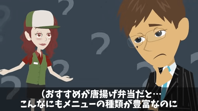 後輩社員は女性の店の弁当の値段が安い上に、種類も多いことに驚きます。 すると女性が「おすすめはから揚げ弁当です」と後輩社員に伝えて…。