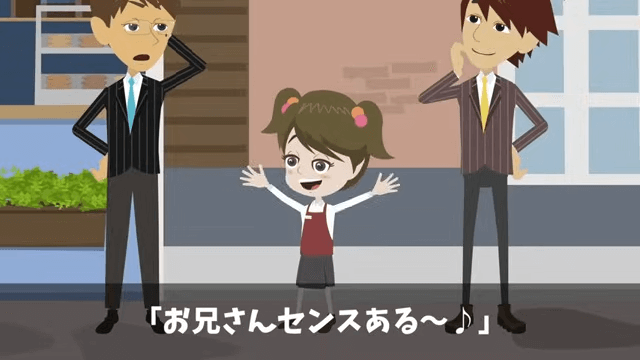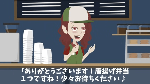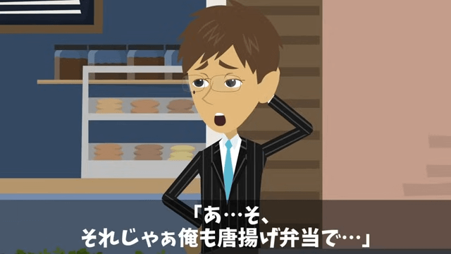 店にやってきた主人公は、いつも通りから揚げ弁当を1つ注文しました。 すると後輩社員も「あ…そ、それじゃぁ俺もから揚げ弁当で…」と言い…。