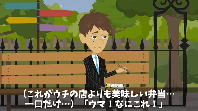 弁当を買ってしまった後輩社員は「まぁこれも偵察の一環…」と考えます。 そして弁当を食べた後輩社員は「ウマ!なにこれ!」と驚きました。