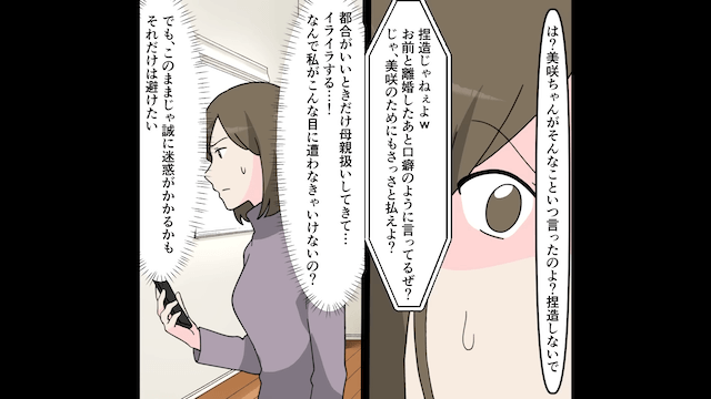 翌日も元夫と継子はしつこく主人公に電話をかけてきて、100万円を催促してきました。 そこで主人公が拒否すると、元夫は夫を巻き込むつもりで「お前が継子を愛さなかった女って知ったらどう思うんだろうな」と脅してきたのです。