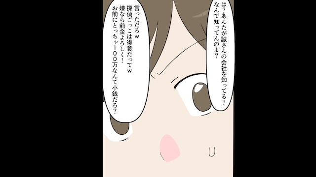 主人公は離婚時の公正証書を友人に見せ、最後の手段として使おうと考えていることを話しました。 それから数日後、主人公の職場までやってきた元夫は、大声で主人公の悪評を流した挙句、主人公を脅して再び100万円を催促してきたのです。