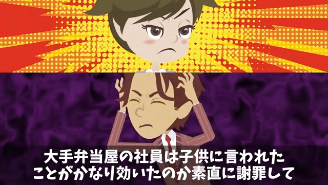 主人公は今回のことを大手弁当チェーンの社長に報告すると男性社員に伝えました。 男性社員は少女の言葉がかなり効いたようで、素直に謝って帰っていき…。