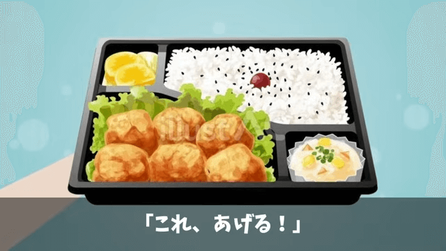 少女は空腹で苦しむ男性社員に「おじさん!」と声をかけました。 そして少女は「これ、あげる!」と言って、男性社員に弁当を手渡したのです。