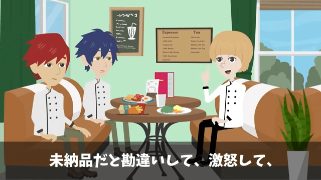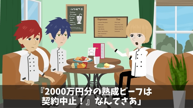 主人公は説明を続けようとしましたが、シェフに電話を切られてしまいました。 どうやらシェフは、すでに納品済みの熟成ビーフを未納品だと勘違いして激怒しているようで…。