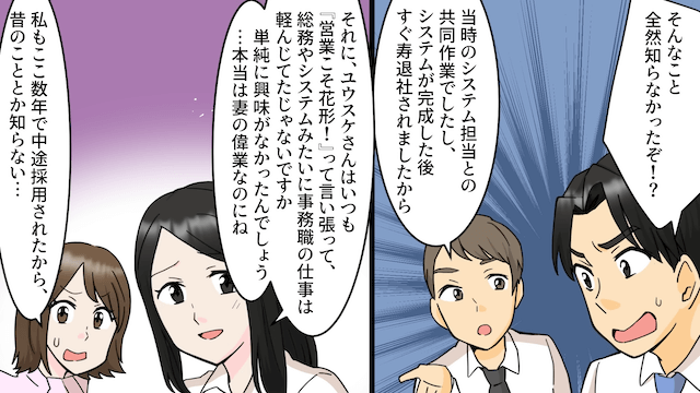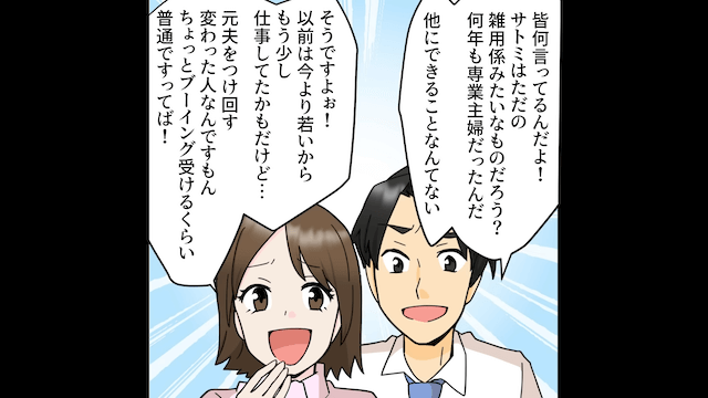 主人公が営業部に行くと、元夫は自分に会いにきたのだと勘違いして主人公をストーカー扱いし、女性と比べて見下してきました。 しかし主人公の偉業を知っている社員たちが主人公を庇うと、元夫は唖然として…。