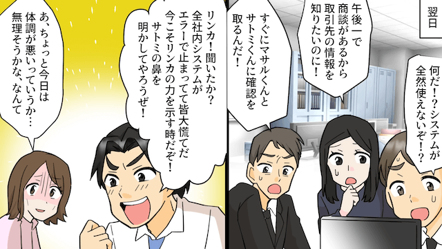 今回は『数年ぶりに会社に復帰した私を見下す元夫「もう結婚してるから(笑)」⇒未練があると勘違いした結果』を紹介します。 社員たちに、夜の店に通っていることをそれぞれ暴露された元夫と女性。 するとその事実を知った2人は、お互いを責め始めて…。