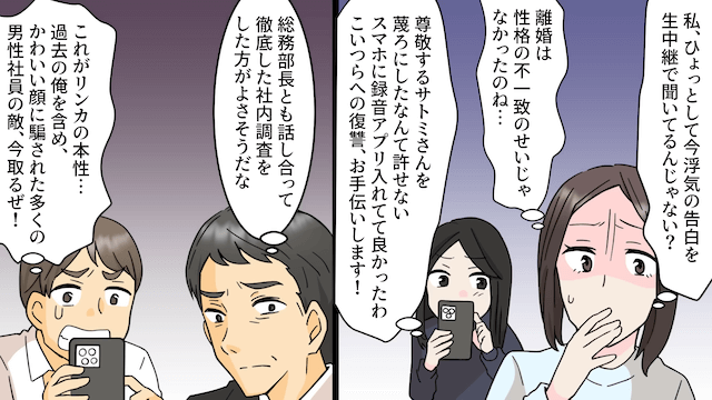 主人公が調べた結果、女性が犯人だと判明し、主人公への僻みでエラーを起こした女性に社員たちは呆れてしまいます。 さらに元夫も女性を責め、2人は責任転嫁をし合って言い争いを始めました。