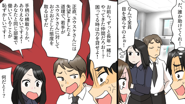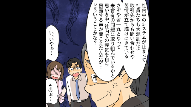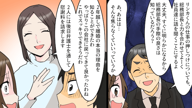 今回は『数年ぶりに会社に復帰した私を見下す元夫「もう結婚してるから(笑)」⇒未練があると勘違いした結果』を紹介します。 お互いの悪事を暴露し、言い争いを始めた元夫と女性。 するとそこに騒ぎを聞きつけた社長がやってきて…。