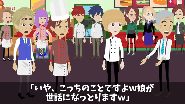 タレントが老人の娘であることを知った主人公は、老人がステーキハウスに来た理由に納得がいきました。 しかし、そんな和やかなムードは一瞬で終わり…。