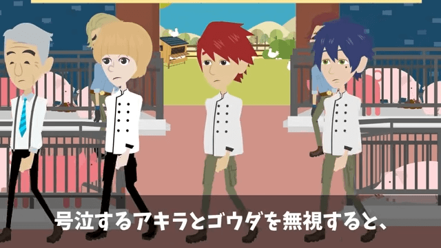 主人公が励ましの言葉を贈ると、シェフたちはタレントのファンクラブの会員を抹消されたことを明かしました。 そして主人公たちは号泣するシェフたちを無視し、老人のステーキハウスに向かったのでした。