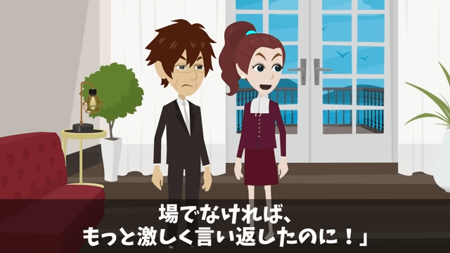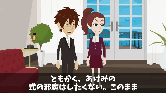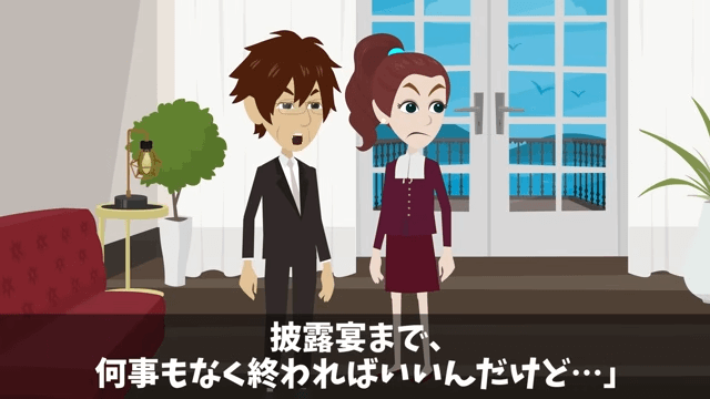 妻は頭取の失礼な態度に腹を立てていました。 そして、とにかく娘の結婚式の邪魔をしたくない主人公は「このまま披露宴まで、何事もなく終わればいいんだけど…」と思ったのです。