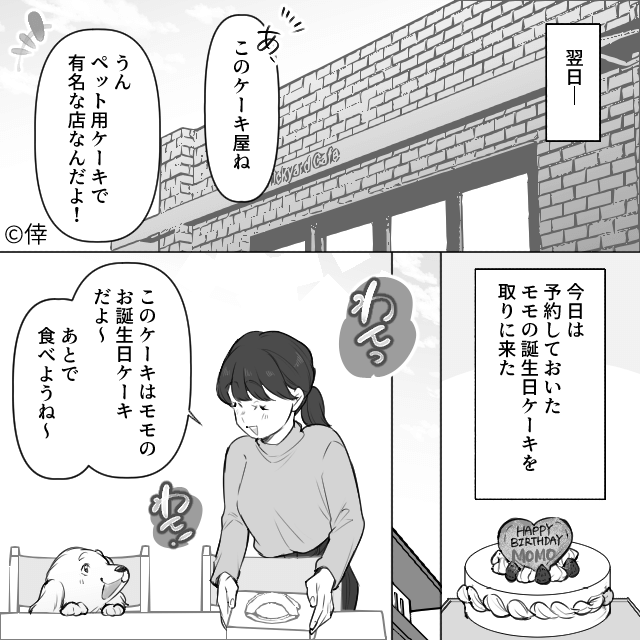 翌日、主人公は愛犬に誕生日ケーキを用意し、誕生日会をするために母の手伝いをしていて…。