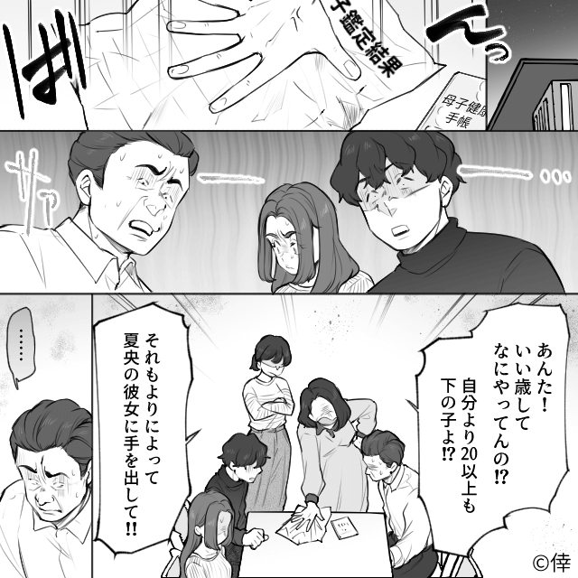 兄の彼女の部屋を探ると、母子手帳とDNA鑑定の結果が出てきました。 DNA鑑定の結果によると、彼女が妊娠している子はなんと父の子で…。