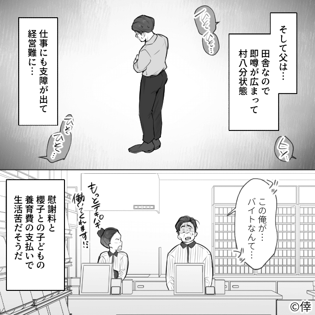 母は父に慰謝料を請求し、その後、離婚。 兄は女性不信になり、兄の彼女は親から勘当されます。