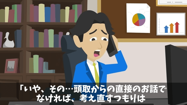 支店長は大口顧客がすべての口座を解約したことを頭取に伝えました。 しかも大口顧客は頭取から直接話がなければ考え直すつもりはないと言っているようで…。