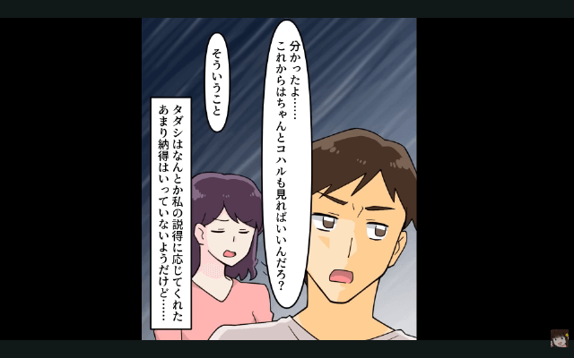 主人公は愛犬のことしか見ていない夫に「これから赤ん坊も生まれてくるのよ」「このまま娘を放っておいたら、あなただって後悔するかもしれないんだからね」と言いました。 すると夫は「わかったよ…これからはちゃんと娘も見ればいいんだろ?」と言いましたが、あまり主人公の言葉に納得はしていないようで…。