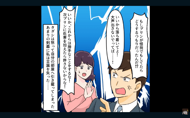 主人公が娘と愛犬と楽しく散歩したことを報告すると、夫は「俺の許可なくこの子を連れ出すなんてどういうことだ!」と怒り出しました。 そして夫は愛犬を他の犬と交流させたくなかったことを明かし、激怒したまま部屋に閉じこもってしまったのです。