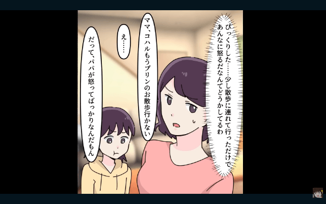 今回は『つわりで苦しむ私に「育児はお前の仕事だろ?俺は犬と散歩行ってくる(笑)」⇒娘と家を出て行った結果』を紹介します。 主人公が娘と愛犬と楽しく散歩したことを報告すると、夫は自分の許可なく愛犬の散歩をしたことに激怒しました。 そして夫は娘が夫に喜んでほしい一心で散歩をしたことなど知らず、主人公を怒鳴りつけて、部屋に閉じこもってしまって…。